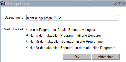 Anhand des Buttons "Filter speichern" kann der Filter für spätere Selektionen gespeichert werden. Hierbei kann noch unterschieden werden, ob der Filter für alle Benutzer und /oder alle Programme bzw. nur für für das aktuelle Programm und/oder dem aktuellen Benutzer gespeichert werden soll.