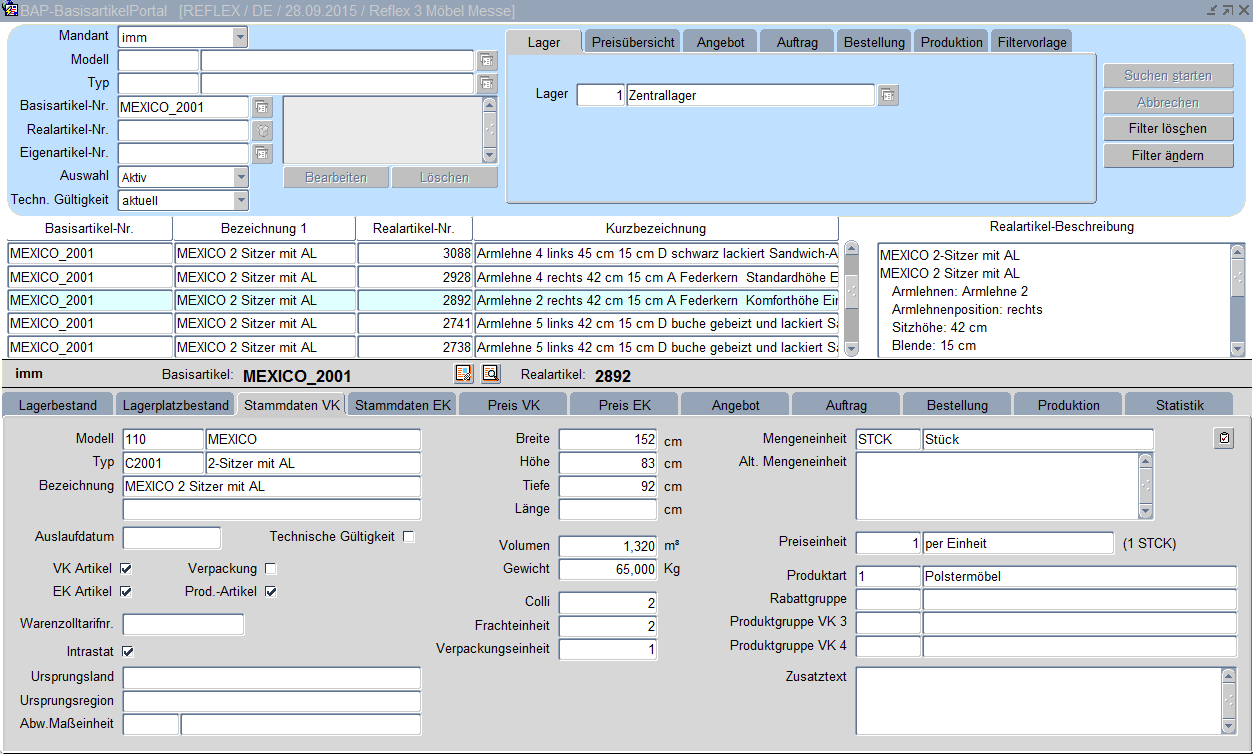 Artikelstammdaten aus dem Bereich Verkauf des markierten Artikels. Die Ermittlung der anzuzeigenden Daten kann mandantenübergreifend über verschiedene Suchkriterien erfolgen. Ebenfalls können Artikel aufgrund von Merkmalen und Ausprägungen gefiltert werden. Grundsätzlich können die Suchkriterien im linken Feld um die Filter der jeweiligen Registerkarte erweitert werden, um die Auswertung in den unten stehenden Registerkarten einzuschränken.