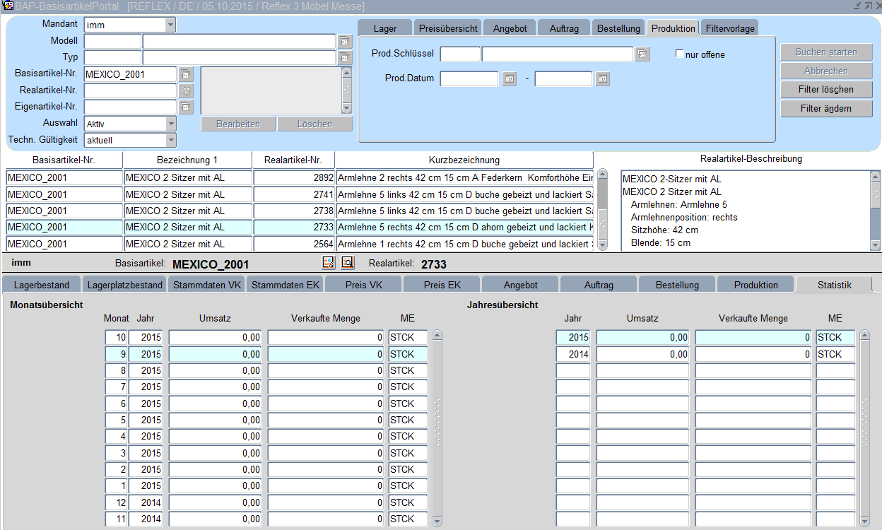 Artikelstatistikdaten aus dem Bereich Umsatz des markierten Artikels. Die Ermittlung der anzuzeigenden Daten kann mandantenübergreifend über verschiedene Suchkriterien erfolgen. Ebenfalls können Artikel aufgrund von Merkmalen und Ausprägungen gefiltert werden.