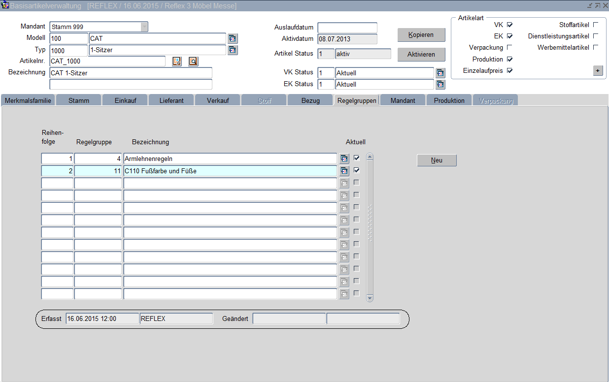 In dieser Maske werden die Regelgruppen für den entsprechenden Basisartikel bzw. die Merkmalsfamilien erfasst und gepflegt. Mit den Regeln wird der Artikel im Einkauf, Verkauf und der Produktion gesteuert. Z. B. Wenn die Bezugsart ein LEDER ist, dann ist die Verpackung entsprechend für LEDER, (sonst VERPACKUNG NORMAL) zu verarbeiten. Mit dem Button „NEU" wechselt das System in die Maske „Regelgruppe verwalten". Es wird empfohlen, entweder mit den Regelgruppen der Merkmalsfamilie oder mit diesen Regelgruppen zu arbeiten. Werden beide Regelgruppen genutzt, kann es zu unübersichtlich werden.