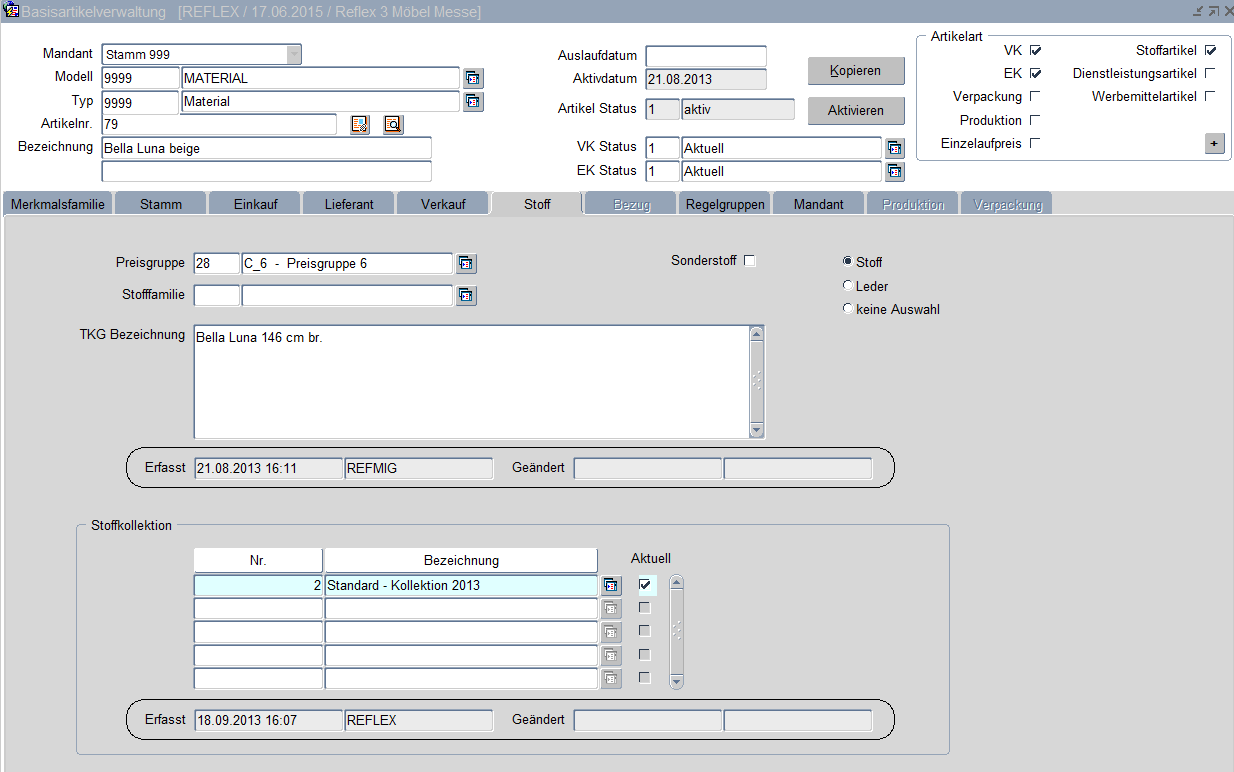 Bezeichnung der entsprechenden Stoffkollektion. Die Stoffkollektionen geben an, welche Stoffe überhaupt auf diesen Artikel bezogen werden können. Es muss mindestens eine Kollektion eingegeben werden.