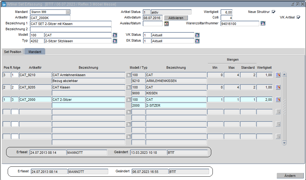 Besteht ein Set aus einem oder mehreren festen Artikeln und verschiedenen wählbaren Artikeln, so ist besonders auf die Wertigkeit sowie den Mengen (Min / Max / Standard) in den Positionen zu achten: