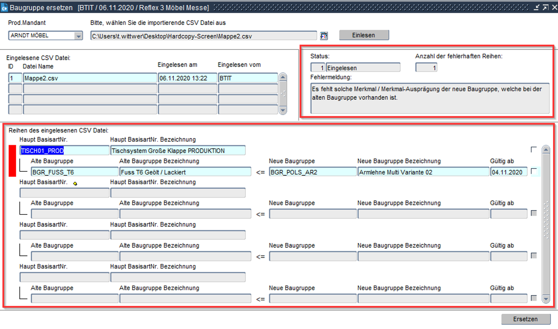 In den meisten Fällen muss dann die Baugruppe korrigiert werden. Nach Korrektur der Baugruppe können die Daten erneut eingelesen werden. Wurden die Datensätze erneut eingelesen, können die fehlerfreien Datensätze markiert und mit dem Button „Ersetzen“ in der Stückliste ersetzt werden.