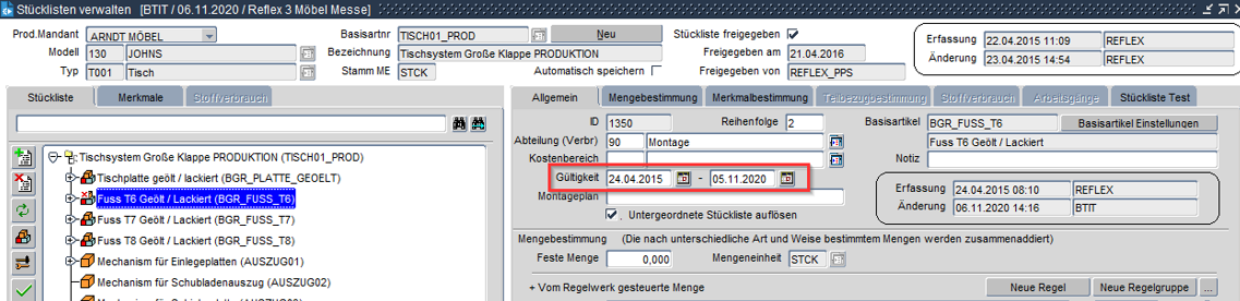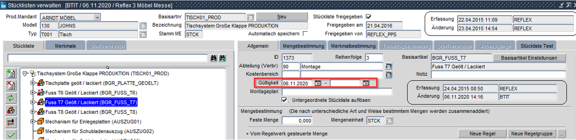 Gleichzeitig wird die Gültigkeit der alten Baugruppe mit „Gültig ab“ Datum abzüglich 1 Tag geschlossen.