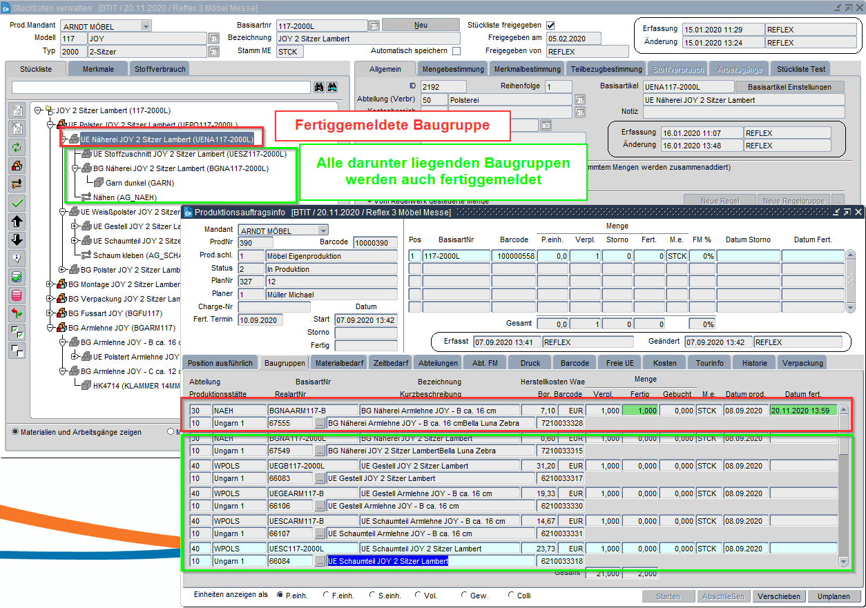 Mit der Baugruppen Fertigmeldung wird dann alles fertiggemeldet, was in der Stückliste unter dieser Baugruppe aufgeführt ist, die Materialien werden abgebucht.