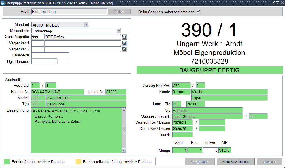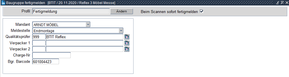 Gemäß dem angegebenen Fertigmeldungsprofil befüllt das Programm die vordefinierten Daten und der Anwender muss nur noch den Baugruppen-Barcode erfassen bzw. einlesen.