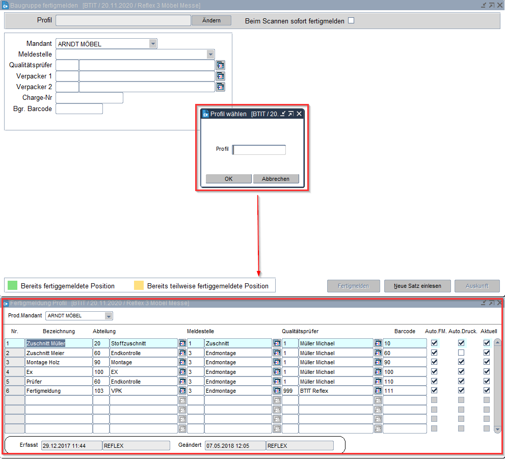 Beim Öffnen der Anwendung ist wei bei anderen Fertigmeldungen ein Fertigmeldungsprofil zu erfassen. Das Profil beinhaltet dann nicht nur die Abteilung und den Qualitätsprüfer, sondern es gibt Voreinstellungen, die den automatischen Druck der Etiketten und das automatische Fertigmelden bestimmen.