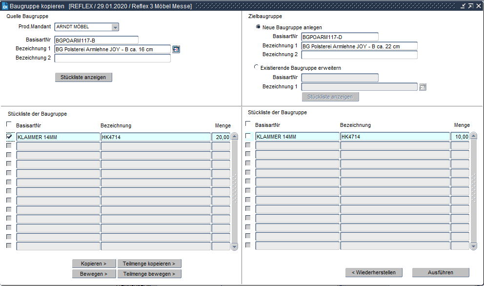 Die Teilmengen der markierten Positionen der Quellbaugruppe werden in die Zielbaugruppe verschoben. Beim Betätigen des Button „Ausführen” werden die Positionen in der Quellbaugruppe dann gelöscht. Wurden Elemente fälschlicherweise kopiert oder bewegt, dann besteht die Möglichkeit vor Betätigen des Buttons „Ausführen“ die Positionen mit dem Button „Wiederherstellen“ zurückzusetzen.