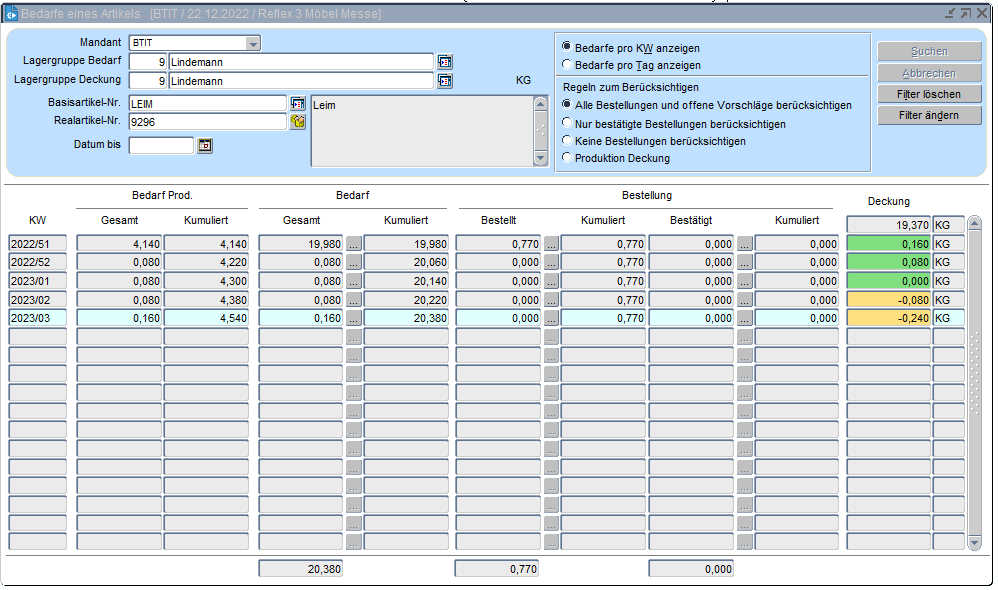 Deckung des Materials zum angegebenen Termin unter Berücksichtigung der in der Suche angegebenen Regel zu den offenen Bestellungen. Befindet sich der voraussichtliche Lagerbestand zum angegebenen Termin bzw. zur angegebenen Kalenderwoche im negativen Bereich, so wird das Feld orange unterlegt. Ist die Deckung ausreichend, wird das Feld grün unterlegt.