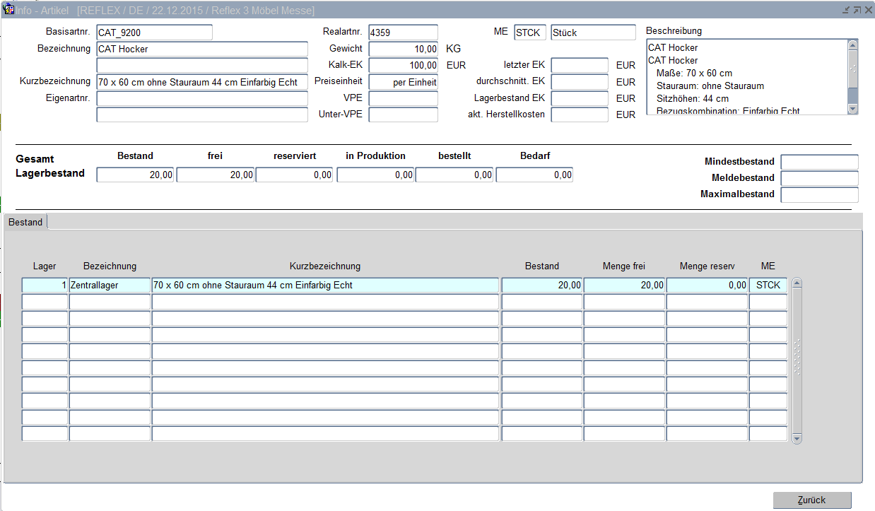 Die Form zeigt einen Überblick der Bestände und Reservierungen je Lager. Mit dem Button "Zurück" wechselt das System wieder in die Auftragsposition.