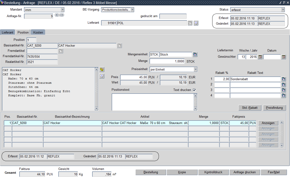Über den Button Std.-Rabatte werden die aktuell gültigen Rabatte aus der Form Lieferant-Rabatt gezogen.