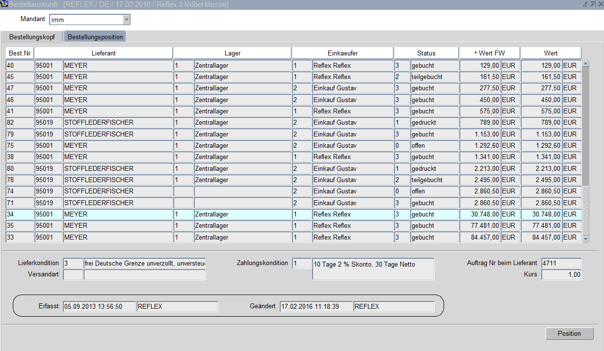 Die Bestellauskunft bietet eine grobe Übersicht aller Bestellungen in Tabellenform. Für die jeweils markierte Bestellung werden im unteren Bereich der Maske noch detaillierte Daten zum Bestellkopf angezeigt.