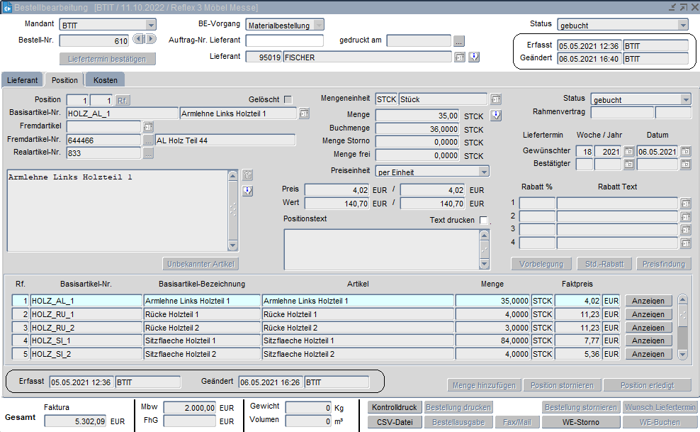 Der bestätigte Liefertermin wird in der Bestellung erfasst und automatisch an die Positionen übergeben, der bei einer Abweichung geändert werden kann. Es kann vorkommen, dass die auftragsbezogenen Bestellungen vom Lieferwerk mit einer von der Kundenwunschwoche abweichenden Lieferwoche bestätigt werden. Die sich hierauf beziehenden Aufträge laufen dann automatisch in den AB-Status „Terminprüfung" und werden im Menüpunkt Liefertermin-Abweichung aufgeführt.