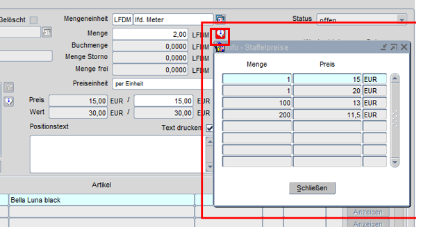 Diese Schaltfläche wird farblich gekennzeichnet, wenn mehr als ein Preis (Staffelpreise) zu dem Artikel mit einem gültigem Preis im Preisvertrag vorhanden ist.