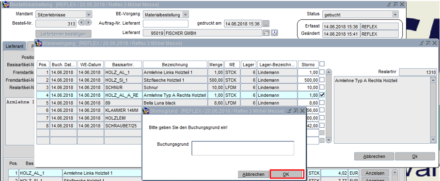 Wurde aufgrund einer Bestellung ein Wareneingang gebucht, so kann dieser über diese Schaltfläche wieder storniert werden. Hierfür öffnet sich eine Maske für die Eingabe des Stornogrundes. Eine Buchung mit der negativen WE-Menge wird vom System vorgenommen.