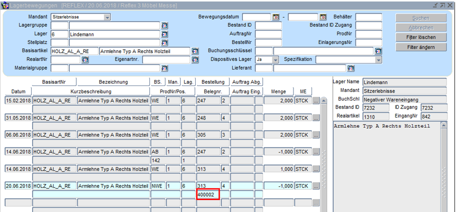 Die entsprechende Beleg-Nr. des Abgangsscheines wird zur jeweiligen Lagerbuchung gespeichert und kann über die Form Lagerbewegung eingesehen werden.