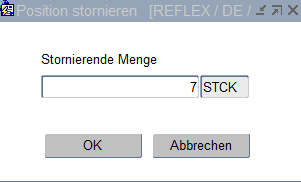 Öffnet ein Fenster, in dem die zu stornierende Bestellmenge eingetragen werden kann. Der Wert wird in das Feld Menge Storno übernommen - der Wert der bestellten Menge verringert sich entsprechend. Die Information an den Lieferanten erfolgt nicht automatisch.
