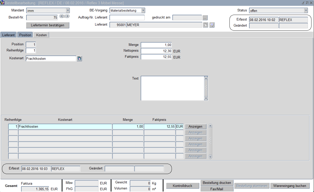 Fallen zusätzliche Kosten vom Lieferanten wie z. B. Transportkosten an, so können diese in der Registerkarte "Kosten" erfasst werden.