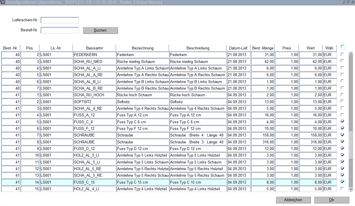 Über den Button "Suchen" werden alle Bestellpositionen, die der oben genannten Suchkriterie entsprechen, aufgelistet.