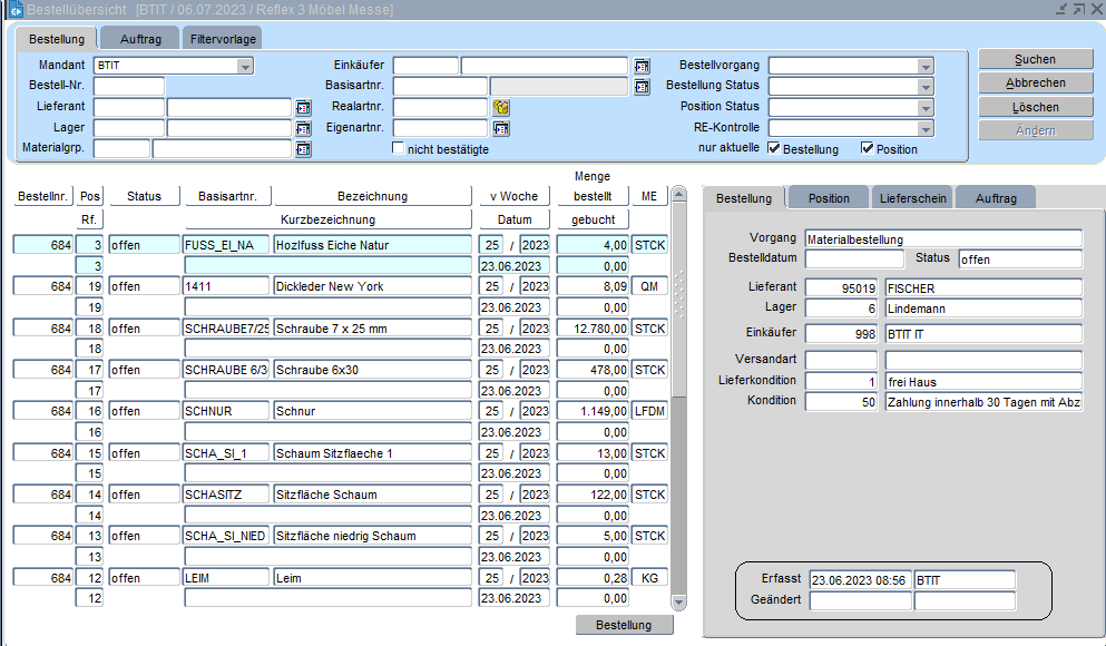 Die Form dient der Übersicht über Bestellpositionen, wobei unter anderem der Status der Bestellung bzw. der Bestellposition in der Suche berücksichtigt werden kann. Es ist möglich, im Filterbereich nach „nur aktuelle Positionen“ bzw. „nur aktuelle Bestellungen“ (offene, bzw. teilgebuchte Pos. oder Bestellungen) zu suchen. Gebuchte und stornierte Positionen bzw. Bestellungen werden in diesem Falle nicht mit ausgegeben. Außerdem wird der Status der Bestellung auf dem Register Bestellung angezeigt.