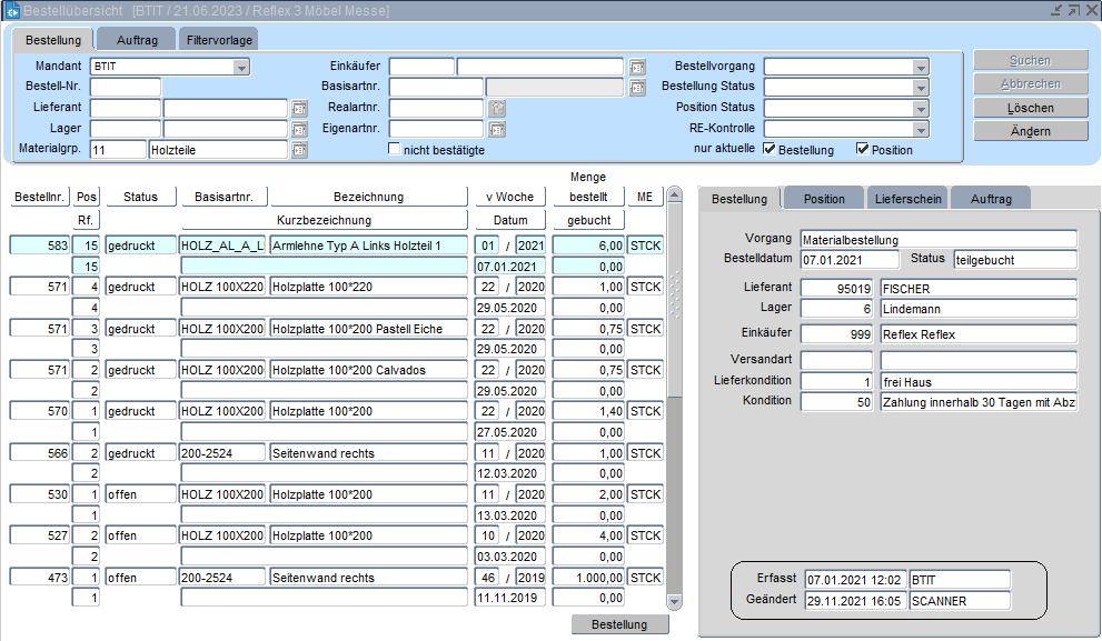 Die Form dient der Übersicht über Bestellpositionen, wobei unter anderem der Status der Bestellung bzw. der Bestellposition in der Suche berücksichtigt werden kann. Es weiterhin möglich, im Filterbereich nach „nur aktuelle Positionen“ bzw. „nur aktuelle Bestellungen“ zu suchen. Gebuchte und stornierte Positionen bzw. Bestellungen werden in diesem Falle nicht mit ausgegeben.