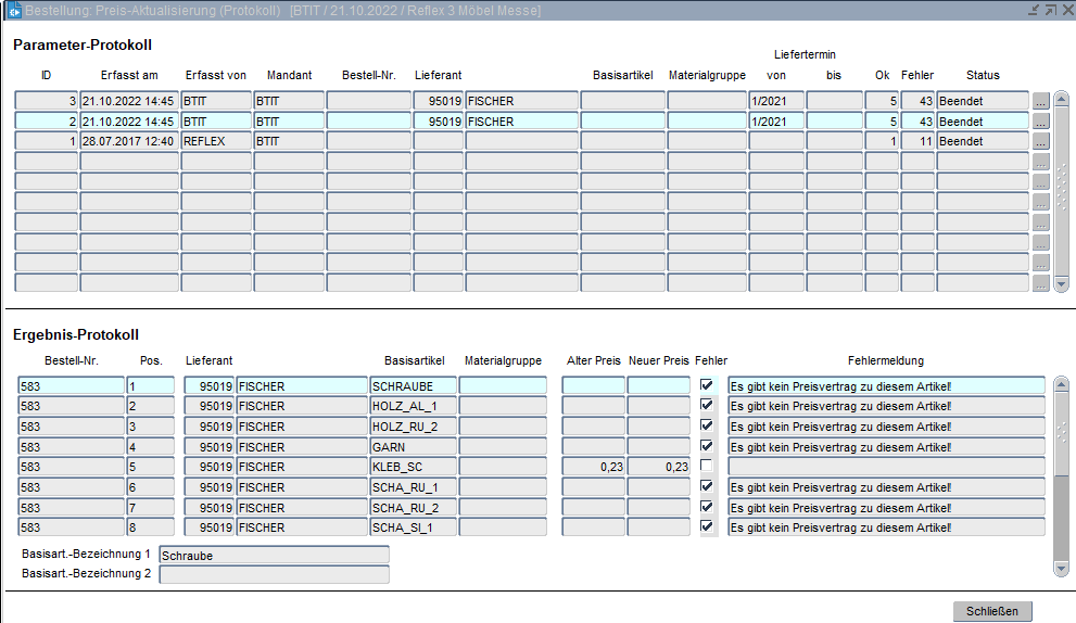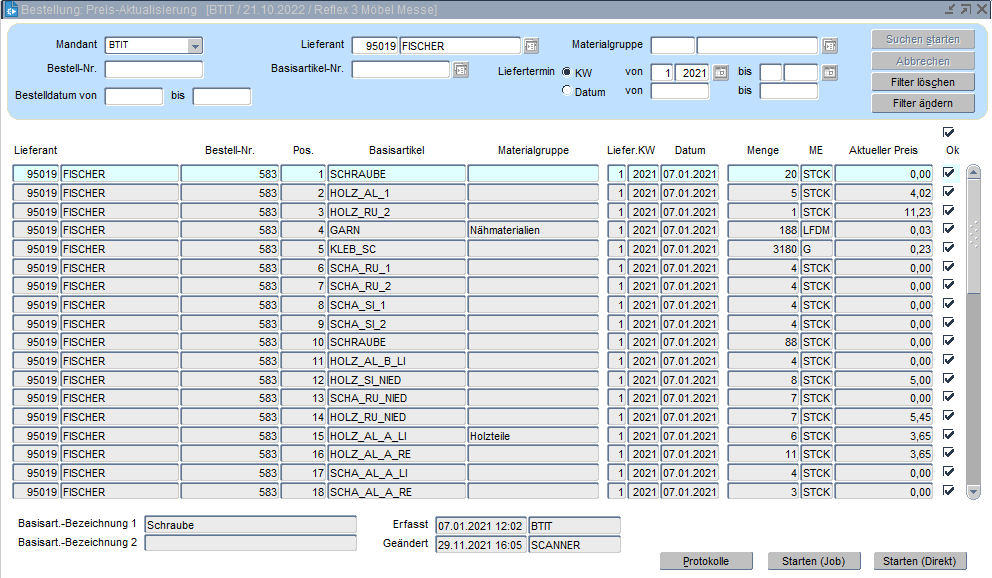 Ändern sich Einkaufspreise und sind die neuen Preise bei einigen Bestellungen noch nicht berücksichtigt, so können diese im Nachhinein durch einen Aktualisierungslauf in den Bestellungen upgedatet werden.