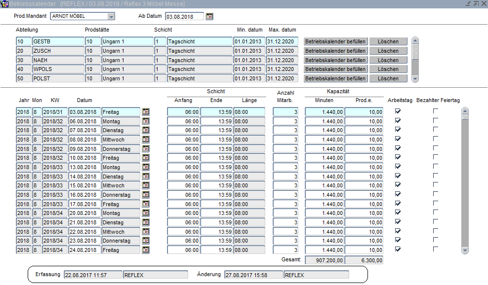 Für die Produktionsplanung und der damit zusammenhängenden Kapazitätsplanung muss ein Betriebskalender je Produktionsstätte, Schicht und Abteilung angelegt werden. Die Kapazitäten werden dann in der Produktionsplanung entsprechend geprüft und angezeigt. Ändert sich kurzfristig die Anzahl der Mitarbeiter aufgrund von Urlaub oder Krankheit, so kann dieses im Kalender nachgepflegt werden. Die Voreinstellungen der Mitarbeiter, der täglichen Kapazität und der Produktionseinheiten je Schicht werden bereits im Menüpunkt "Produktionsstätte" hinterlegt. Vor Anlage des Betriebskalenders sollten die Stammdaten im Menüpunkt "Feiertage" für die nächsten Jahre eingepflegt werden, da diese bei Erstellung des Kalenders berücksichtigt werden.