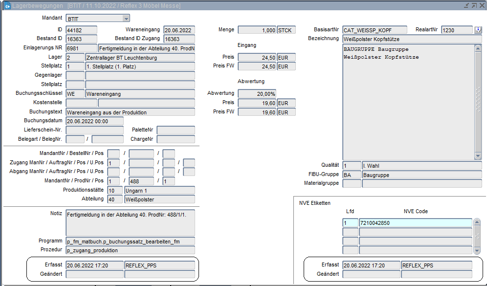 Nummer der vom System automatisch vergebenen Bestand ID bei der Wareneingangsbuchung.