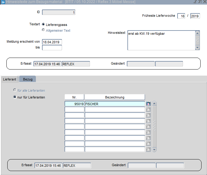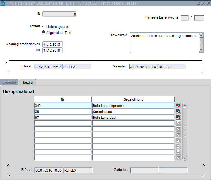 Gibt es wichtige Hinweise zum Bezugsmaterial für die Auftragserfassung, so können Hinweistexte für bestimmte Bezugsmaterialien in dieser Maske erfasst werden. Stoffe, bei denen Lieferengpässe bestehen, können mit einem Informationstext und frühester Lieferwoche versehen werden. Bei der Anlage der Texte wird ein Zeitraum angegeben werden, in dem der Text erscheinen soll.