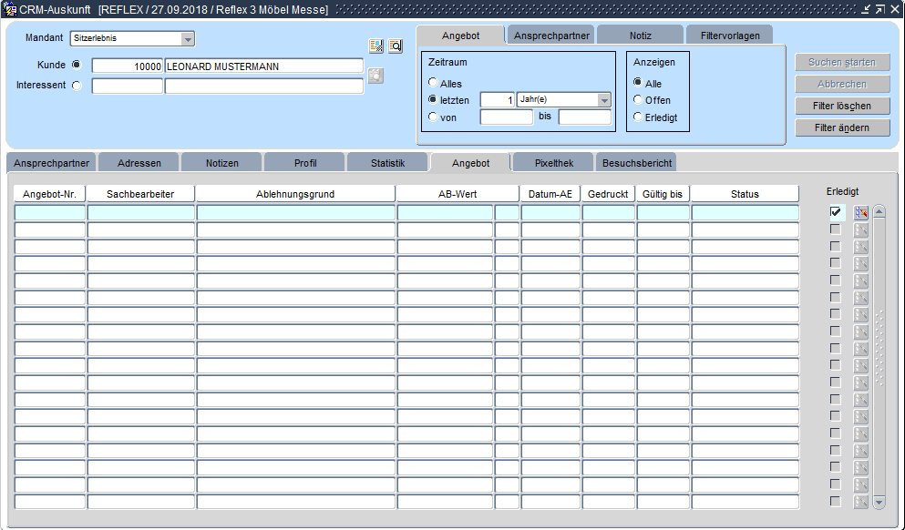 CRMCRM Auskunft CRM Auskunft - Angebot CRM Auskunft - Angebot Sofern Angebote für das ausgewählte Kundenkonto geschrieben wurden, werden sie in diesem Fenster angezeigt.
