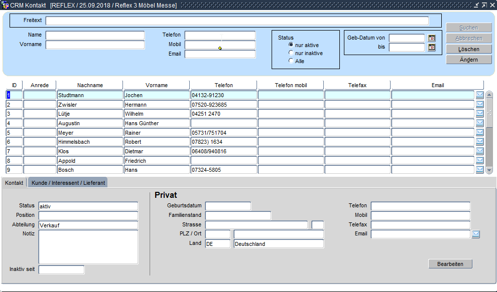 Im CRM Kontakt Programm kann nach allen im System hinterlegten Kontakten gesucht werden. Dabei kann neben den Standard-Suchfeldern auch nach einem Freitext gesucht werden.