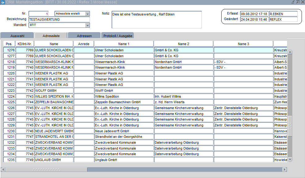 Auf der Registerkarte Adressliste wird das Ergebnis der Marketingauswahl dargestellt. Die Adressen werden in Zeilenform angezeigt. Der Anzeigebereich wird über den Scrollbar geändert. Die Spaltenüberschriften können für die Sortierung genutzt werden.