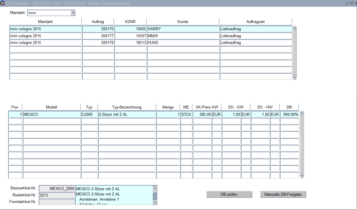 Ist der Deckungsbeitrag nicht erreicht worden, wird der Auftrag als DB-gesperrt gekennzeichnet. Ob eine Deckungsbeitragsprüfung bei einer bestimmten Auftragsart überhaupt erfolgt, wird in der Auftragsartsteuerung als Auftragsschritt bestimmt. Die DB-Sperre kann zustande kommen, wenn der Verkaufspreis zu niedrig ist aber auch wenn der Einkaufspreis falsch gespeichert wurde. In dieser Maske kann der Auftrag erneut auf Deckungsbeitrag geprüft werden. Dieses ist sinnvoll, wenn der Einkaufs- oder Verkaufspreis verändert wurde. Er kann aber auch über den Button "Manuelle DB-Freigabe" manuell frei gegeben werden.