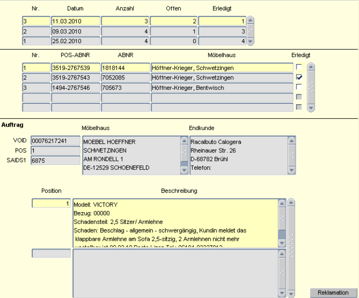 Hier werden die übertragenen Daten der POS-Direktbeauftragung eingelesen und angezeigt. Über den Button „Reklamation“ wird dann zu der ausgewählten AB-Nummer die Reklamation erfasst.