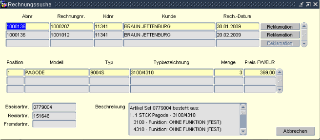 Ist der Auftrag mit mehreren Rechnungen fakturiert worden, so erscheint automatisch ein weiteres Fenster, in dem die entsprechende Rechnung ausgewählt werden muss. Mit dem Button „Reklamation“ wird die Erfassung des Reklamationsvorganges mit der ausgewählten Rechnungsnummer aufgerufen.