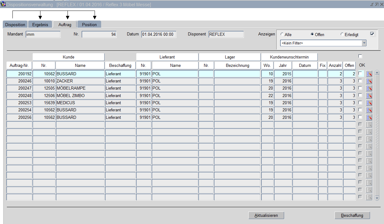 An dieser Stelle werden die einzelnen Aufträge, die für die Artikelbeschaffung anstehen, mit Angabe der Lieferanten bzw. des Lagers und dem Kundenwunschtermin aufgeführt. Die Anzahl der gesamten und der noch für die Beschaffung offenen Positionen werden je Auftrag angezeigt.