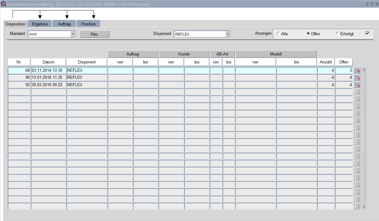 Angabe, welche Dispositionen angezeigt werden sollen. Alle - es werden alle Dispositionsläufe, unabhängig von der Bearbeitung, angezeigt. Offen - nur Dispositionsläufe mit offenen Aufträgen, wofür noch Ware beschafft werden muss, werden angezeigt. Erledigt - Dispoläufe für deren Aufträge die Beschaffung der Ware bereits erledigt wurde, werden angezeigt.