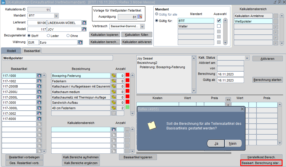 Mit dem Button „Basisart. Berechnung starten“ wird für alle Teilerealartikel eines Basisartikels, bei denen noch keine Berechnung der Kalkulation vorgenommen wurde (Anzahl = 0), die Berechnung gestartet. Nach der Bearbeitung stehen also alle Teilerealartikel im Status „gelb“. Diese Funktionalität steht nur zur Verfügung, wenn für die Berechnung kein VK-Realartikel als Vorlage vorhanden sein muss. Nach dem Drücken des Buttons kommt auch hier noch mal eine Sicherheitsabfrage, ob die Berechnungen gestartet werden sollen.