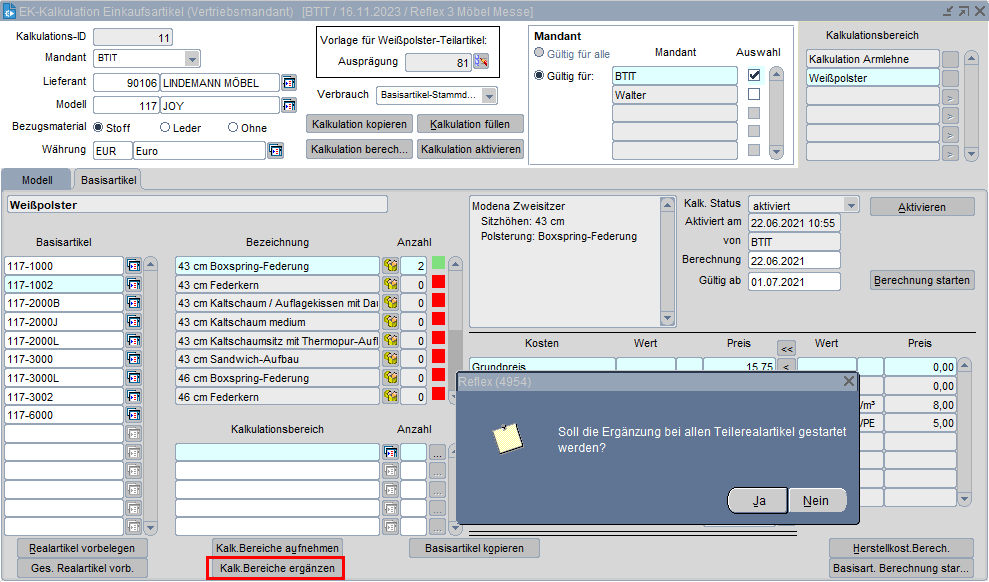 Nach Eingabe der Daten werden über den Button "Kalkulation füllen" sämtliche zum Modell gehörende Basisartikel automatisch in die Form geladen. Gleichzeitig werden oben rechts die gültigen Kalkulationsbereiche des Modells vom System angezeigt. Grundsätzlich gibt es den Bereich "Weißpolster".