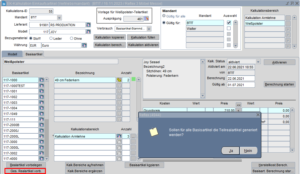 Mit diesem Button „Ges. Realartikel vorb.“ werden für alle Basisartikel die Teilerealartikel erzeugt. Es werden also alle Teilerealartikel für alle möglichen Kombinationen für sämtliche Basisartikel erzeugt. Nach dem Drücken des Buttons kommt noch einmal eine Sicherheitsabfrage, ob die Generierung gestartet werden soll. Der Fortschritt der Generierung wird durch die Markierung des jeweiligen Basisartikels angezeigt. Am Ende der Bearbeitung steht der Cursor wieder auf dem ersten Basisartikel.