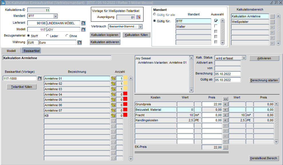 Das Modell JOY hat wählbare Armlehnen. Die Kosten der einzelnen Armlehnen sind gleich, egal bei welchem Typ die Armlehne angebracht wird. Somit werden in der Registerkarte Basisartikel die Daten ohne Berücksichtigung der Armlehnen hinterlegt. Diese Kalkulationen der verschiedenen Armlehnen werden in der Registerkarte Modell gespeichert. Für die Ermittlung des EK´s werden dann die entsprechend gültigen Kalkulationsbereiche addiert.