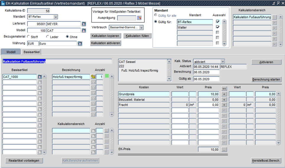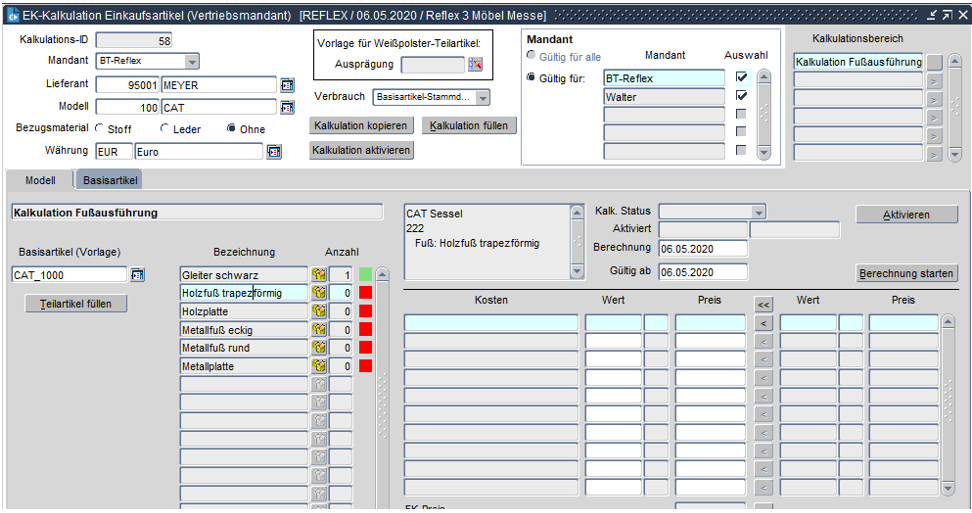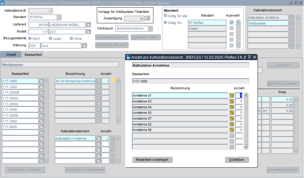 Werden zu den Basisartikeln eines Modells unterschiedliche Armteile oder Fußteile angeboten, so könnte man theoretisch für jede Version eine eigene Kalkulation unter Basisartikel für den Kalkulationsbereich "Weißpolster" hinterlegen.