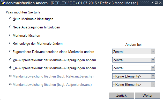 Merkmalsfamilie Änderungen - EK-Aufpreisrelevanz der Merkmal-Ausprägungen ändern