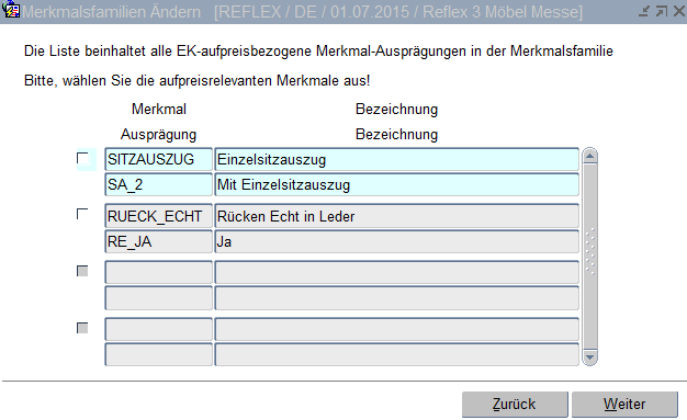 Mit dem Button "Weiter" öffnet das System eine weitere Maske, in der alle EK-aufpeisbezogenen Merkmalsausprägungen angezeigt werden. Hier kann die EK-Aufpreisrelevanz durch Anklicken des Kästchens aktiviert bzw. durch Herausnehmen des Häkchens deaktiviert werden.