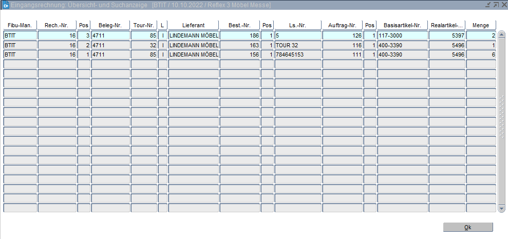 Die Rechnungskontrolle erfolgt, indem der Rechnung eine oder mehrere Bestellungen zugeordnet und die gelieferten Mengen und EK-Preise automatisch mit den Bestellungen abgeglichen werden. Da Lieferantenrechnungen häufig sehr viele Positionen haben, ist eine Mehrfachauswahl in der Übernahme der Bestellpositionen vorhanden. Nachdem der Lieferant, die Beleg-Nr und das Datum der Rechnung, des Beleges und des Einganges gespeichert wurden, kann die Übernahme der Bestellpositionen mit dem Button "Bestellübernahme" erfolgen. Das System wechselt in die Maske "Bestellpositionen übernehmen".