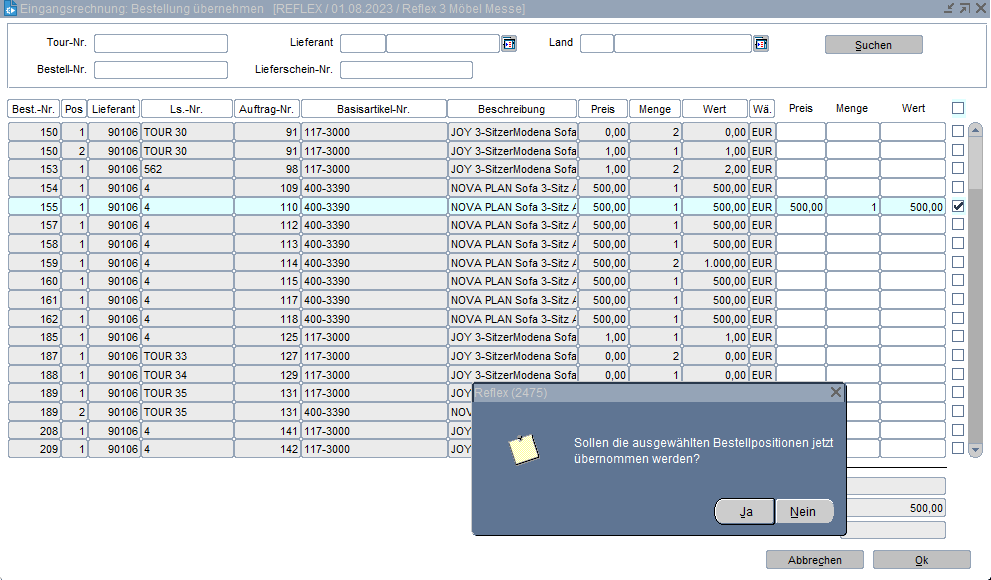 Mit dem Button "Bestellübernahme" wechselt das System in die Maske "Bestellpositionen übernehmen", in der die Auflistung der Bestellpositionen nach Tour, Lieferant und Bestellung gefiltert werden kann. Hier werden die gelieferten Bestellpositionen markiert und in die Eingangsrechnung übernommen.