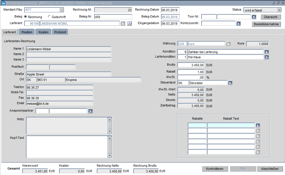 Mit dem Button "Kontrollieren" wechselt das System in den Menüpunkt "Eingangsrechnung kontrollieren". Hier können die einzelnen Bestellpostionen mit den Lieferposition verglichen, auf kontrolliert gesetzt und übernommen werden.