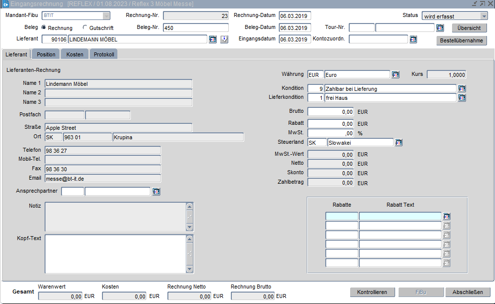 Auf der Registerkarte Lieferant wird der Brutto-Rechnungsbetrag sowie der Rabatt eingegeben. Der Nettowert sollte nach der Bearbeitung der Rechnungspositionen mit dem Gesamt-Fakturawert im Fuß der Maske übereinstimmen.
