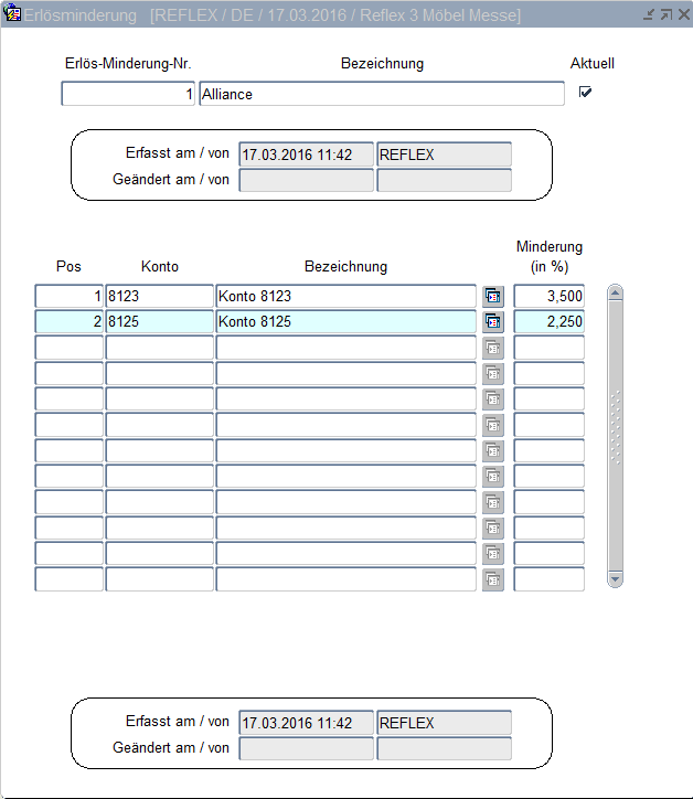 In der Form Erlösminderung werden im oberen Block die Erlösminderungs-Nr. und die Bezeichnung vergeben. In dem unteren Block können dann die Konten zugeordnet werden. Pro Konto kann ein Minderungssatz in Prozent angegeben werden.