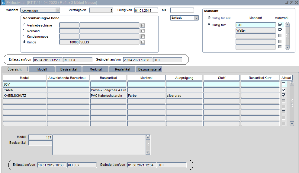 Die Regelung der Exklusivität von Modellen, Typen, Basisartikeln, Merkmalsausprägungen, Realartikeln und Bezugsmaterialien werden in dieser Anwendung verwaltet. Es werden kunden-, kundengruppen-, verbands-, und vertriebsschienenspezifische Exklusiv-Verträge verwaltet. Abhängig davon, auf welcher Ebene die Exklusivität definiert wird, sind die entsprechenden Felder gefüllt. So wird sichergestellt, dass exklusive Ausführungen in der Auftragserfassung nur für die berechtigten Kunden erfasst werden.